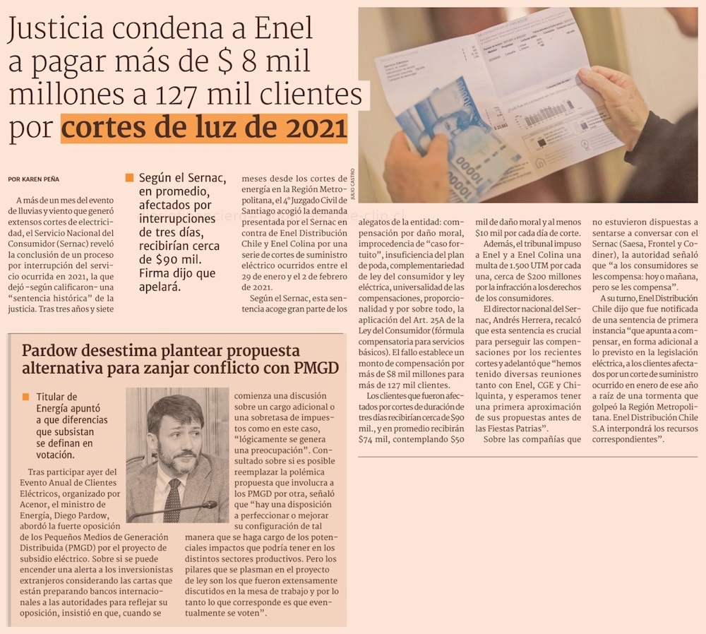Condenan a Enel a pagar indemnizaciones sobre los $8 mil millones por cortes de luz de 2021 - (El Mercurio de Santiago)