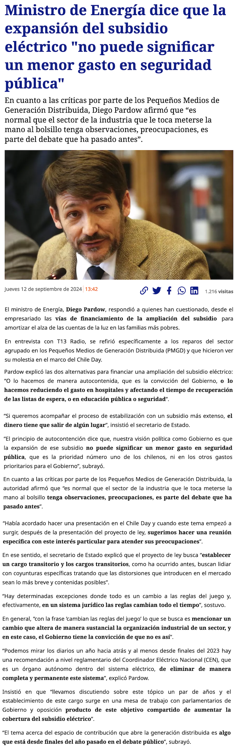 Pardow llama a las pequeñas generadoras a tener diálogo más constructivo por subsidios eléctricos - (La Tercera Online)