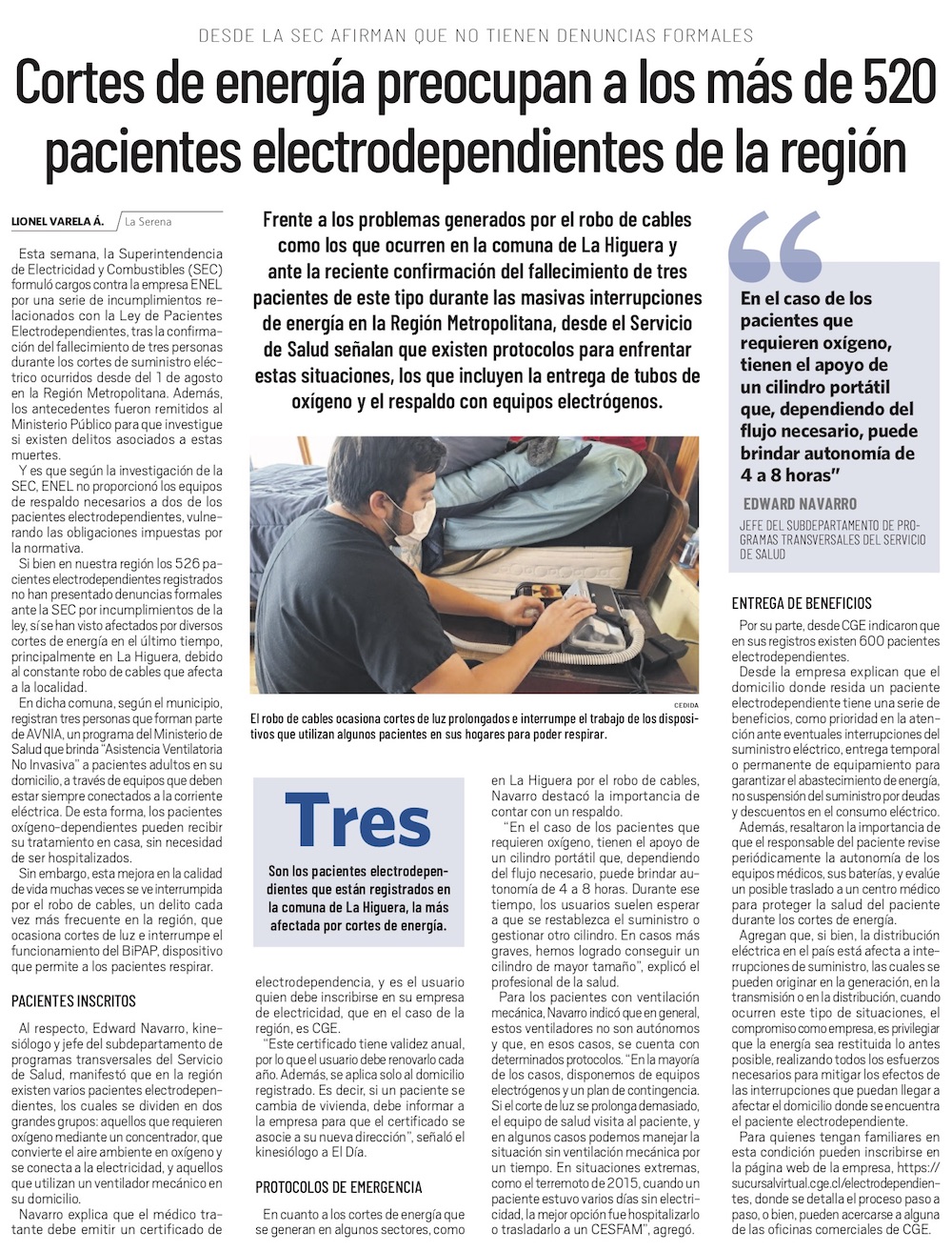 Muerte de personas electrodependientes complica más a Enel tras cortes de luz - (Medios Regionales Cadena El Mercurio)