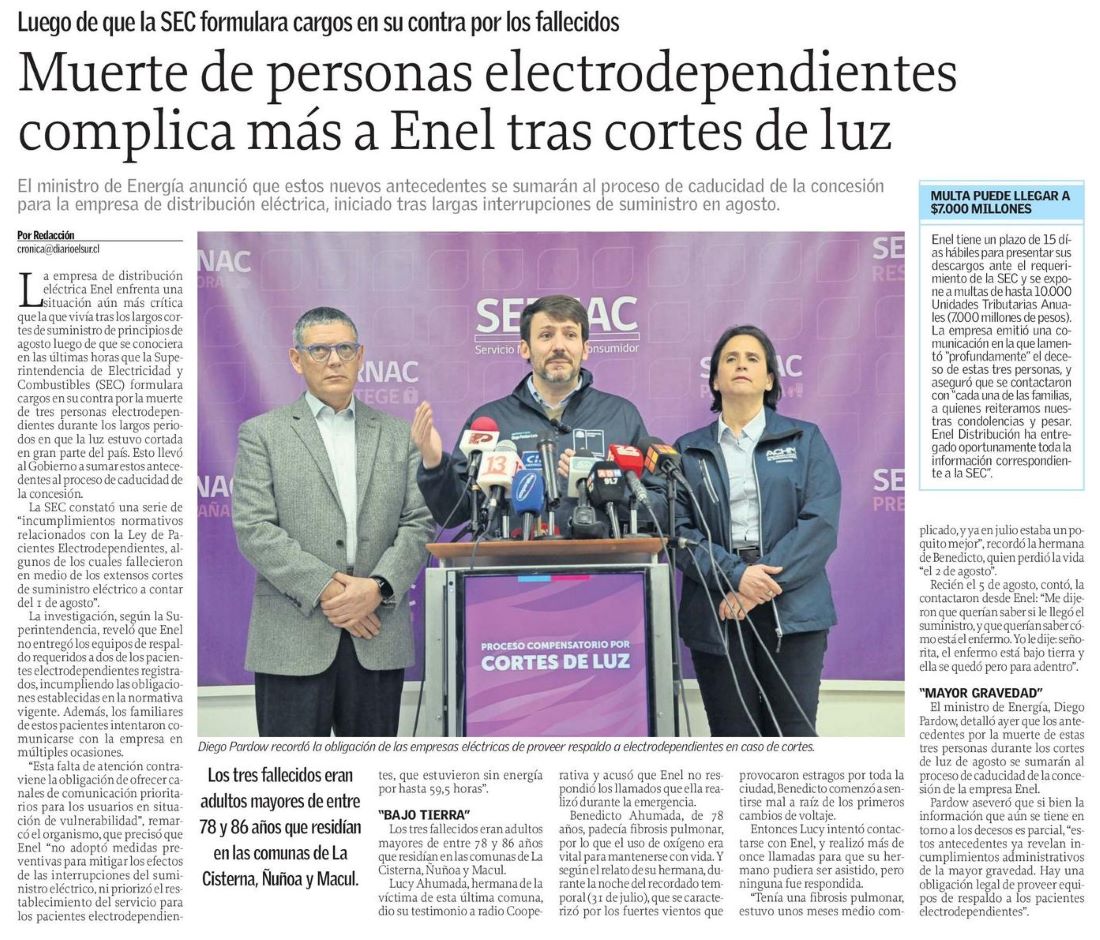 Muerte de personas electrodependientes complica más a Enel tras cortes de luz - (Medios Regionales Cadena El Mercurio)