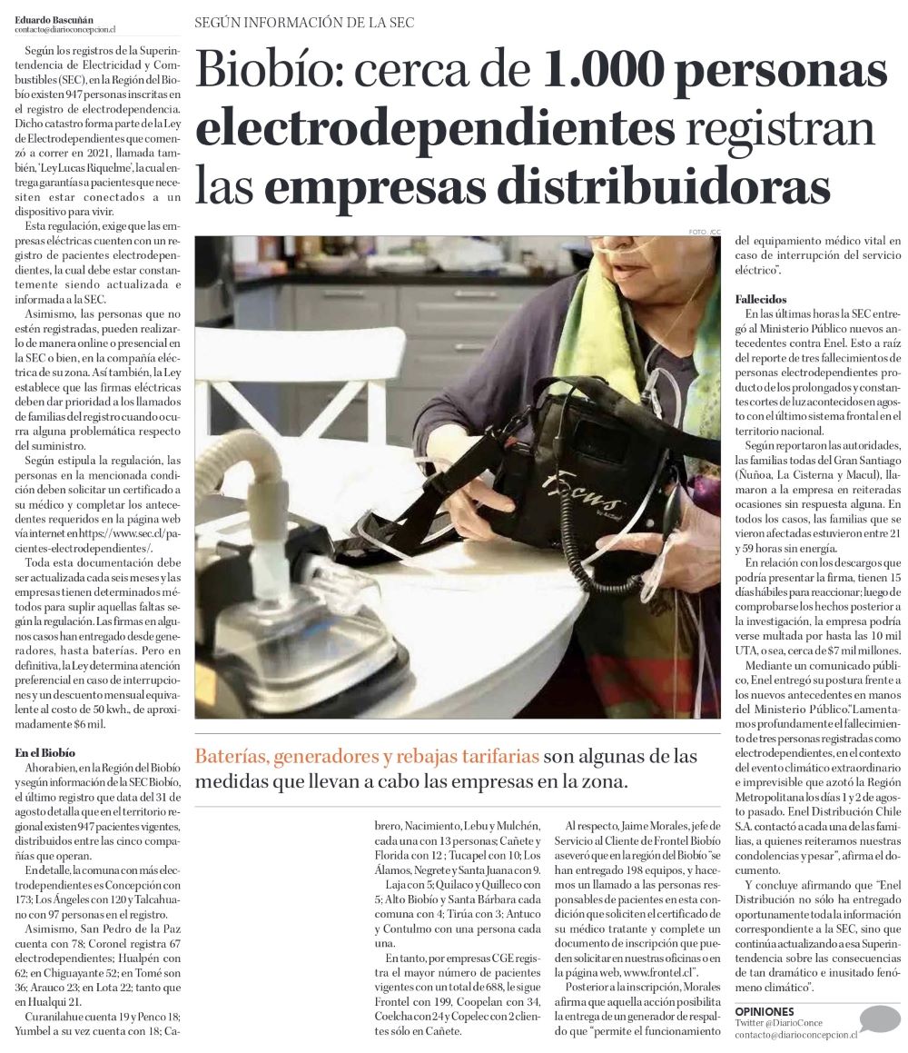 Fallecimiento de electrodependientes será incluido en el procesode caducidad de Enel - (El Mercurio de Santiago)
