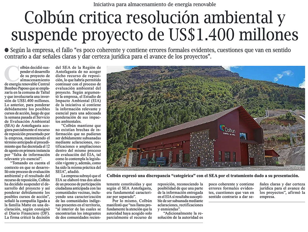Colbún decide suspender desarrollo de proyecto por US$ 1.400 millones tras no acogerse recurso de reposición - (Diario Financiero)