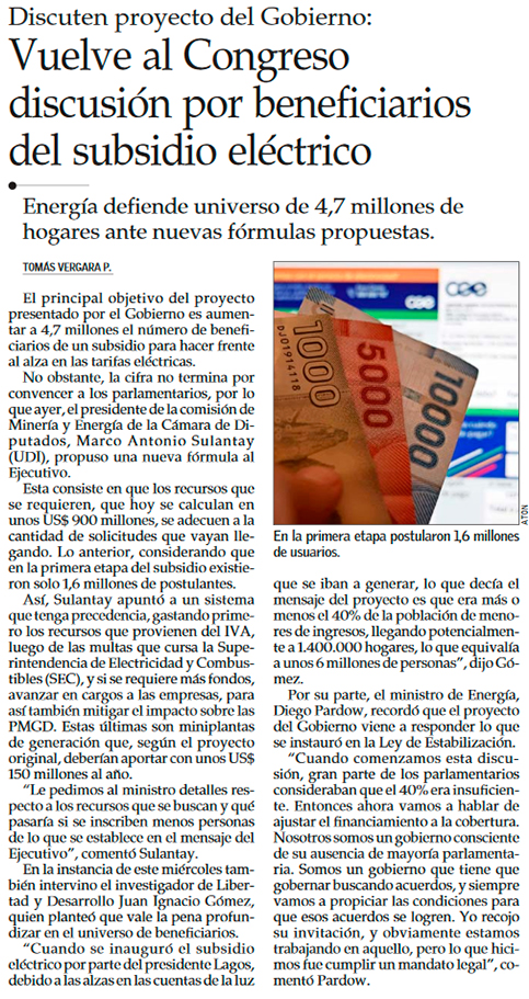 Subsidio eléctrico: Gobierno reafirma voluntad de ajustes y diputados definen fecha para votar - (Diario Financiero)