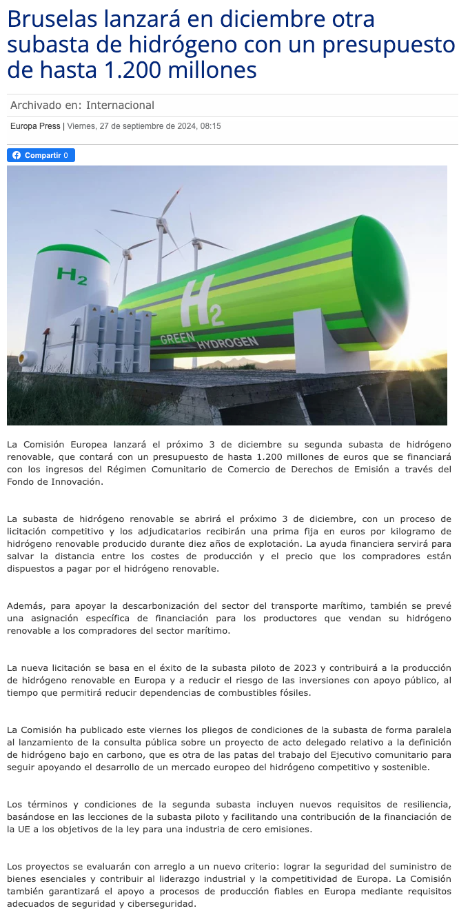 Bruselas impulsa el hidrógeno renovable con una nueva subasta del Banco Europeo de Hidrógeno - (h2news.cl)