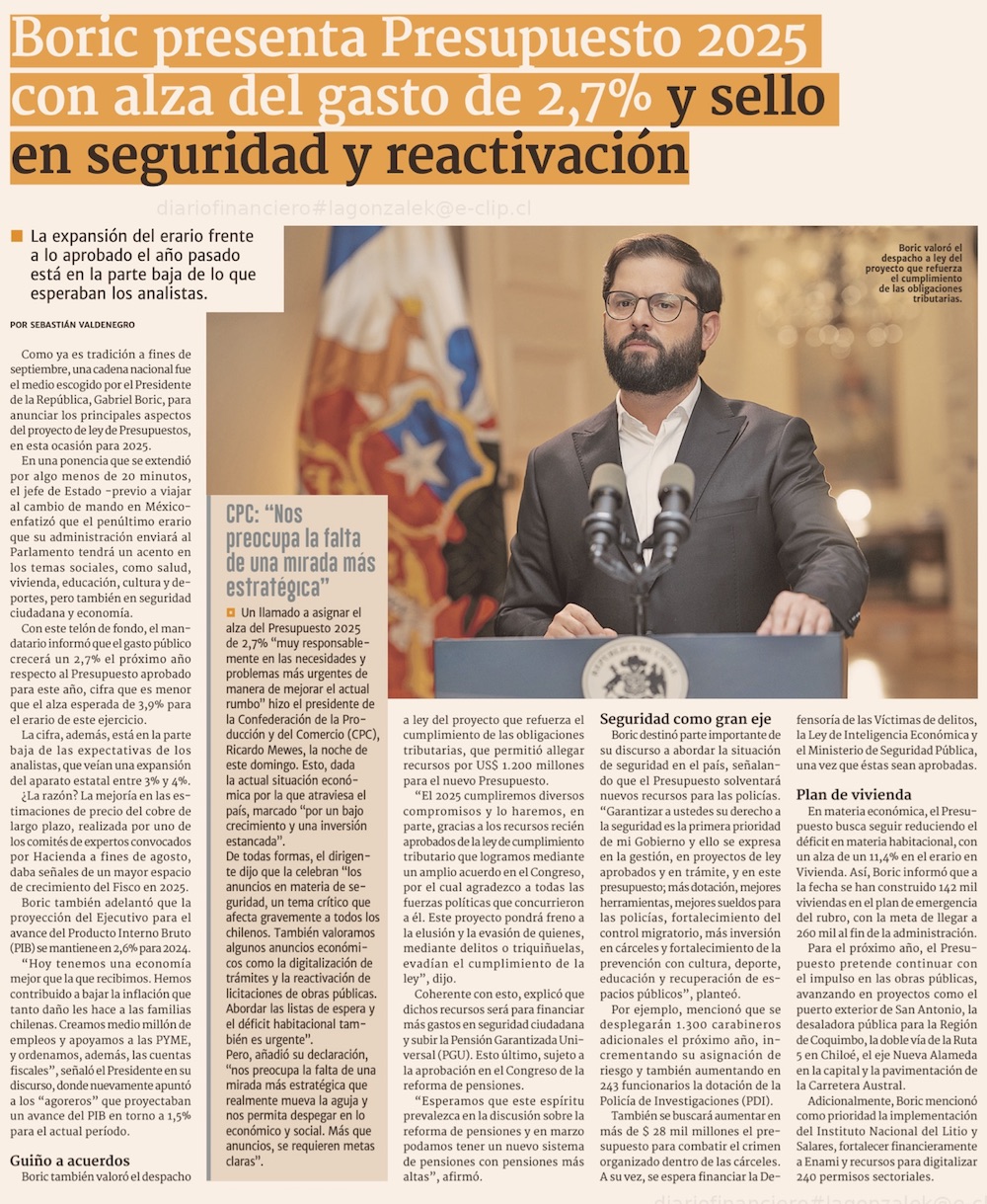 Presupuesto 2025 crecerá por sobre la proyección de crecimiento de mediano plazo - (El Mercurio de Santiago)