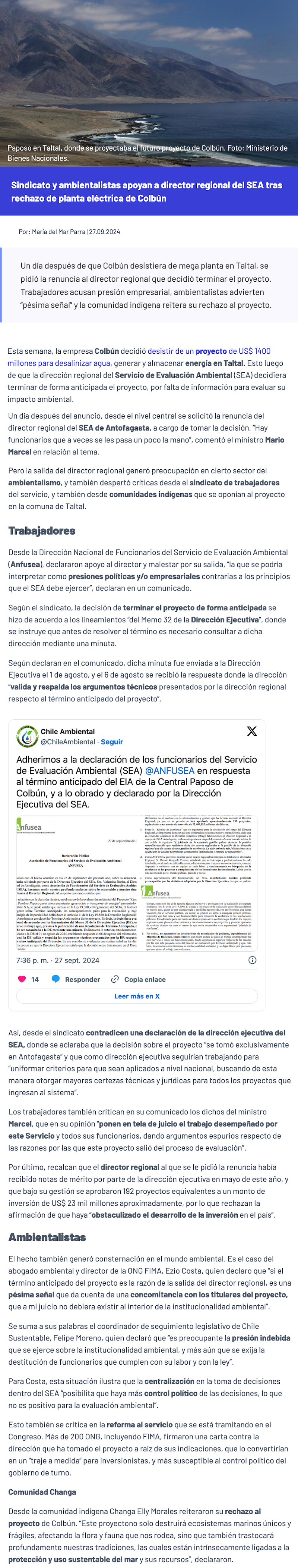 Funcionarios del SEA responsabilizan a Directora Ejecutiva por rechazo de proyecto - (El Mercurio de Antofagasta)