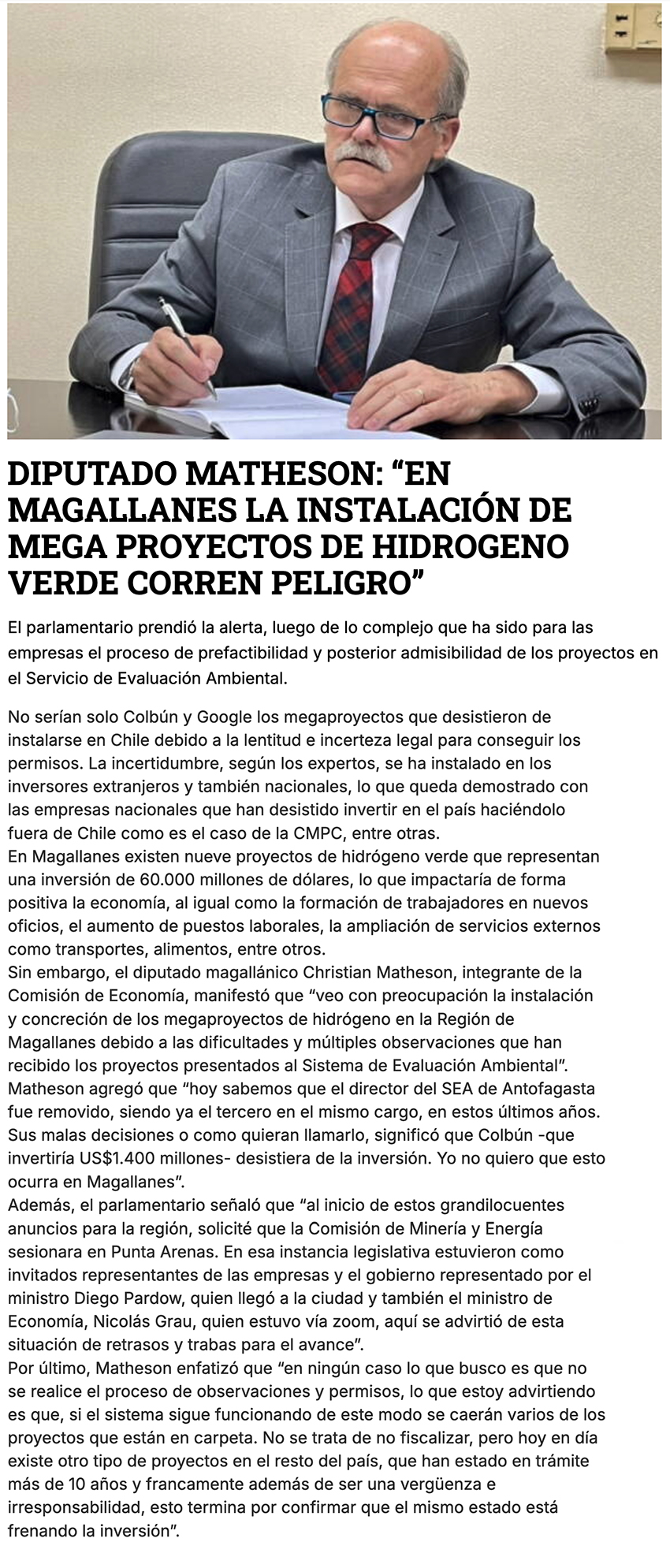 Diputado Christian Matheson: “En Magallanes la instalación de megaproyectos de hidrógeno verde corre peligro” - (ovejeronoticias.cl)