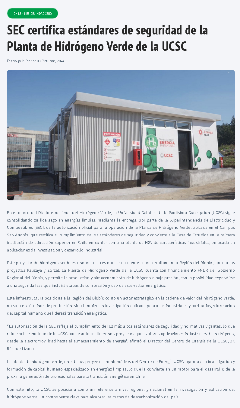 SEC certifica operación de planta de hidrógeno verde UCSC - (El Sur)