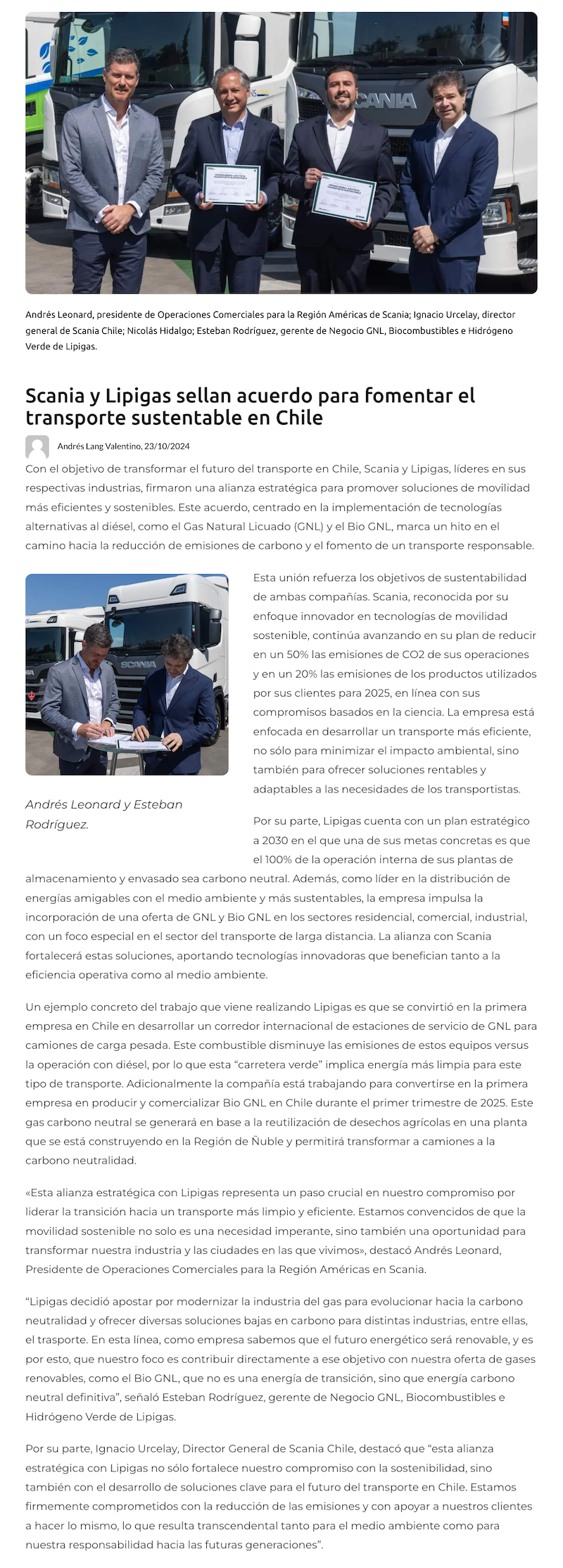 Scania y Lipigas sellan acuerdo para fomentar el transporte sustentable en Chile - (presslatam.cl)