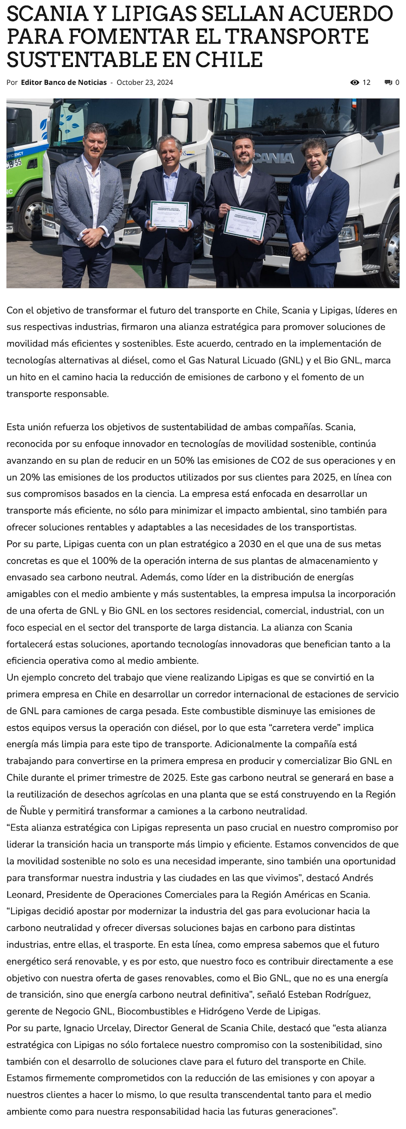 Scania y Lipigas sellan acuerdo para fomentar el transporte sustentable en Chile - (espaciot.cl)