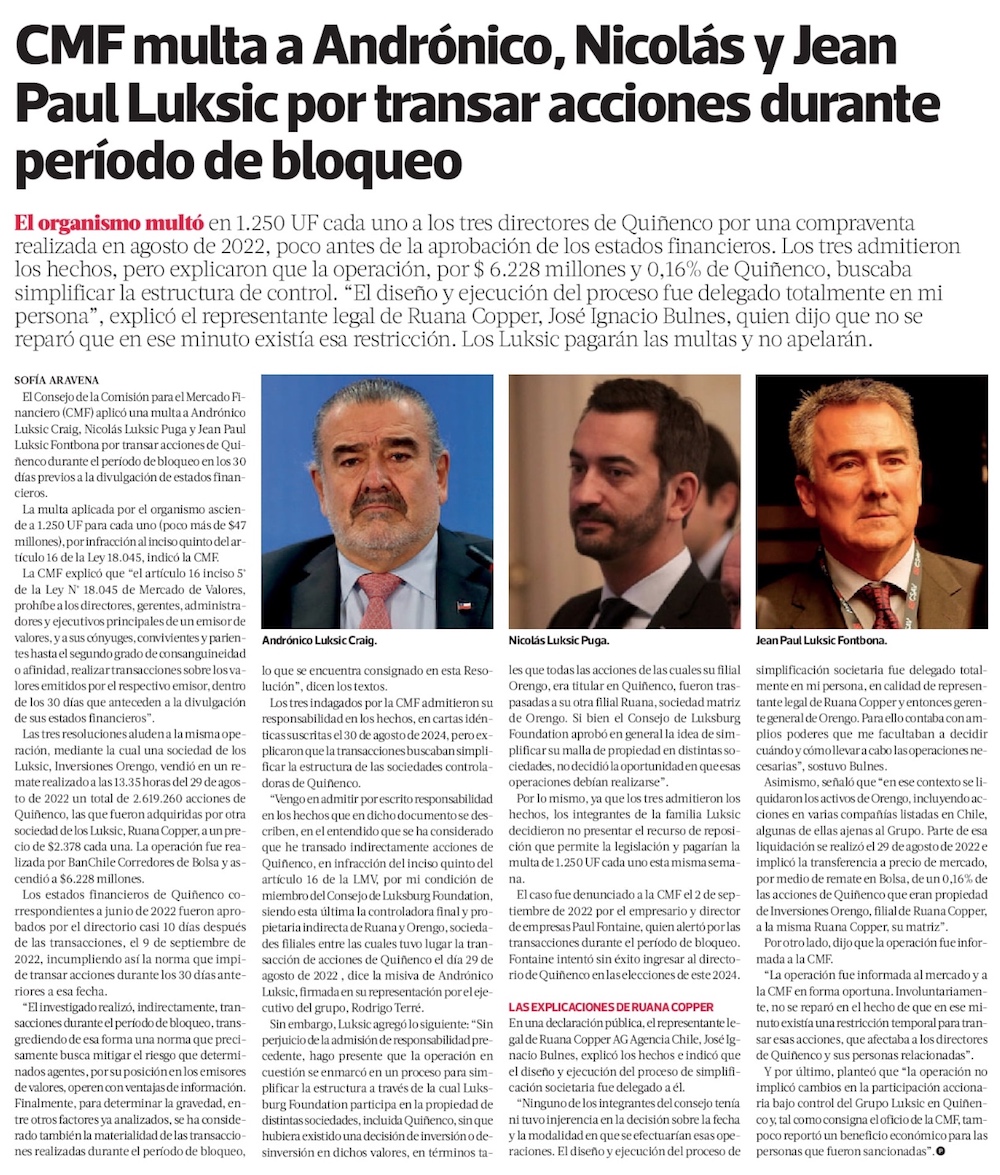 Andrónico, Jean-Paul y Nicolás Luksic aceptan multa por operaciones con Quiñenco - (El Mercurio de Santiago)