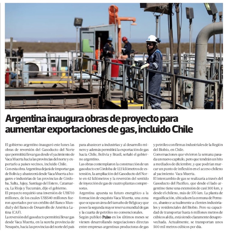 Argentina se prepara para exportar gas a Chile, Bolivia y Brasil tras inaugurar obra en Vaca Muerta - (Diario Financiero)