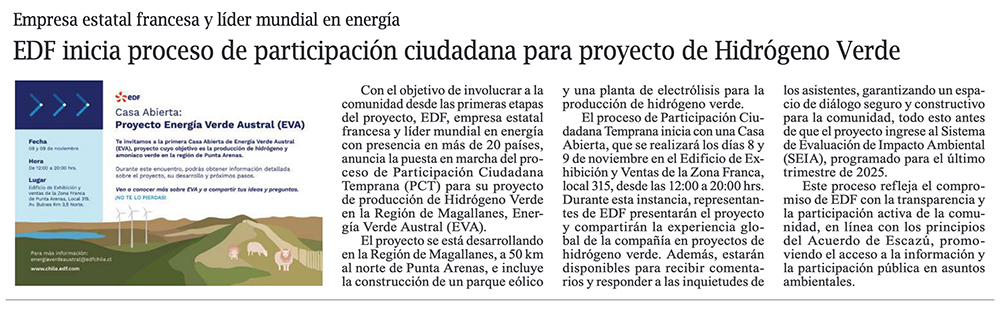 EDF inicia proceso de Participación Ciudadana Temprana para proyecto de Hidrógeno Verde en Magallanes - (ovejeronoticias.cl)