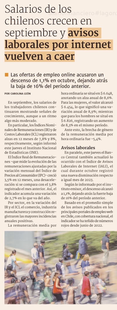 Salarios reales van en su 19ª alza seguida - (El Mercurio de Santiago)