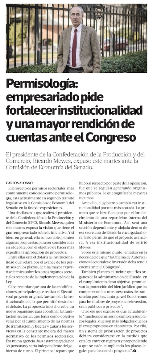 CPC alerta sobre aumento de costos vinculados a evaluación de proyectos por “permisología” - (El Mercurio de Santiago)