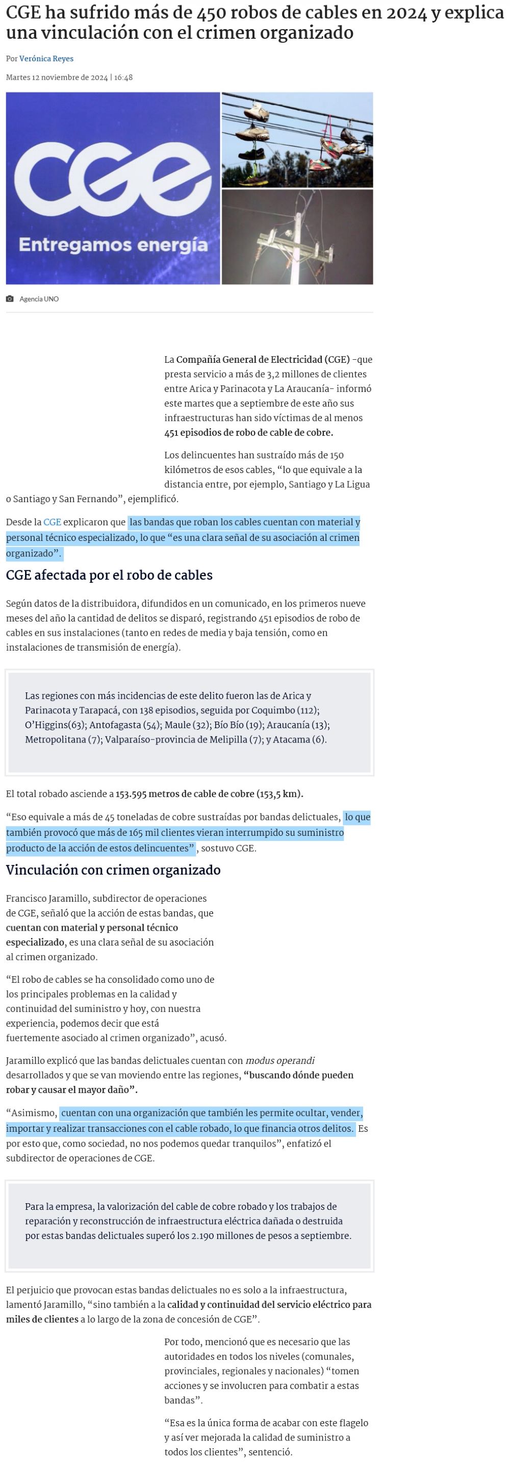 CGE reporta robo de más de 150 kilómetros de cables de cobre a septiembre de este año - (DF Online)