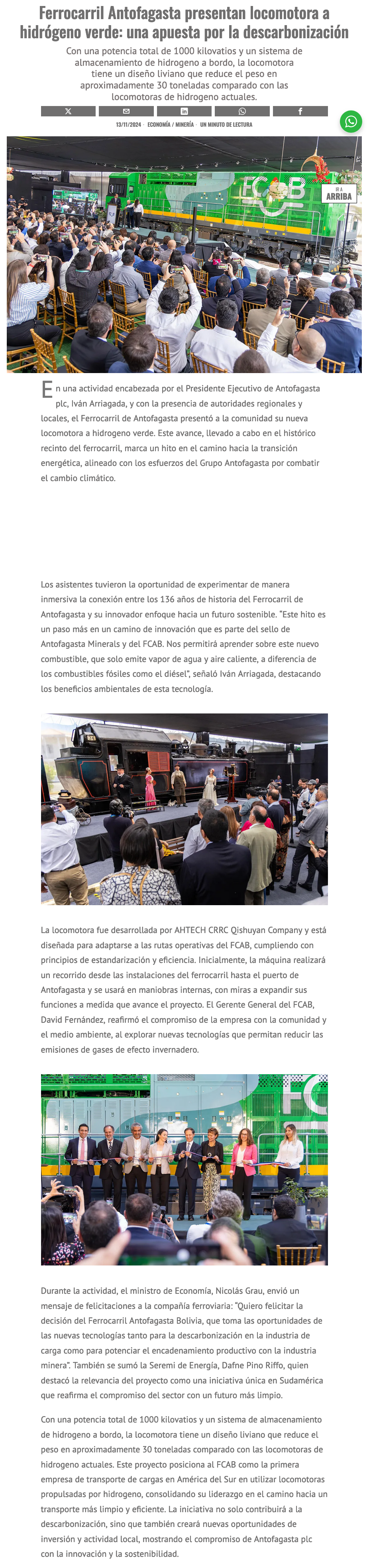 FCAB inaugura en Antofagasta la primera locomotora a hidrógeno verde de Sudamérica - (antofagastaaldia.cl)