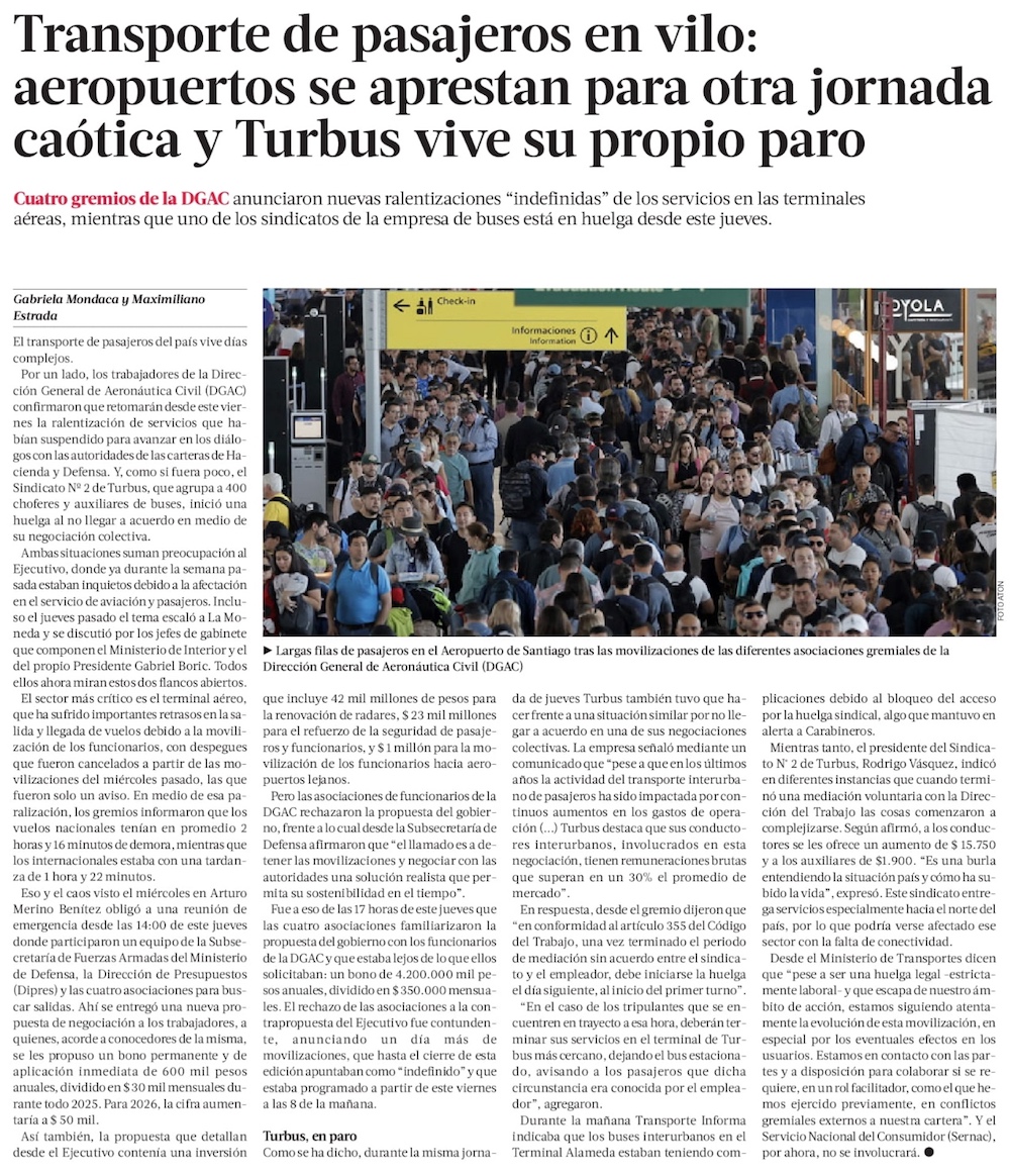 Aeropuertos: trabajadores de DGAC anuncian nueva “ralentización” de servicios desde este mediodía, si no llegan a acuerdo con el Gobierno - (El Mercurio de Santiago)