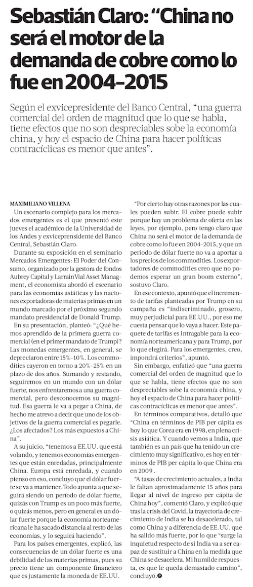 Claro ve riesgos para China ante otra guerra comercial y el precio de materias primas - (Diario Financiero)