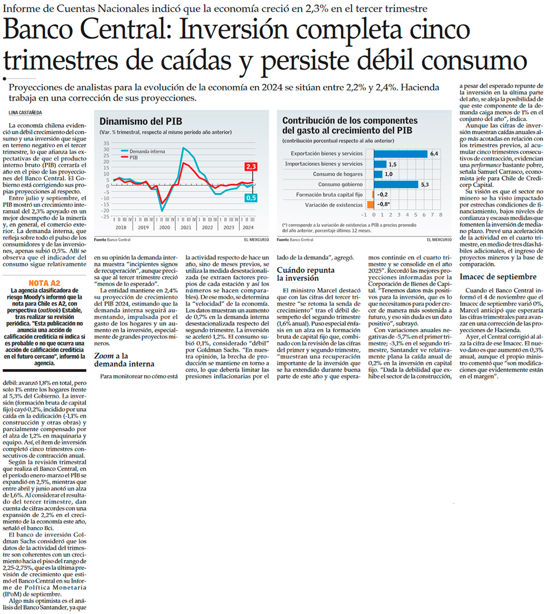 PIB crece más de 2% en el tercer trimestre, pero se instala inquietud en el mercado por consumo e inversión - (Diario Financiero)