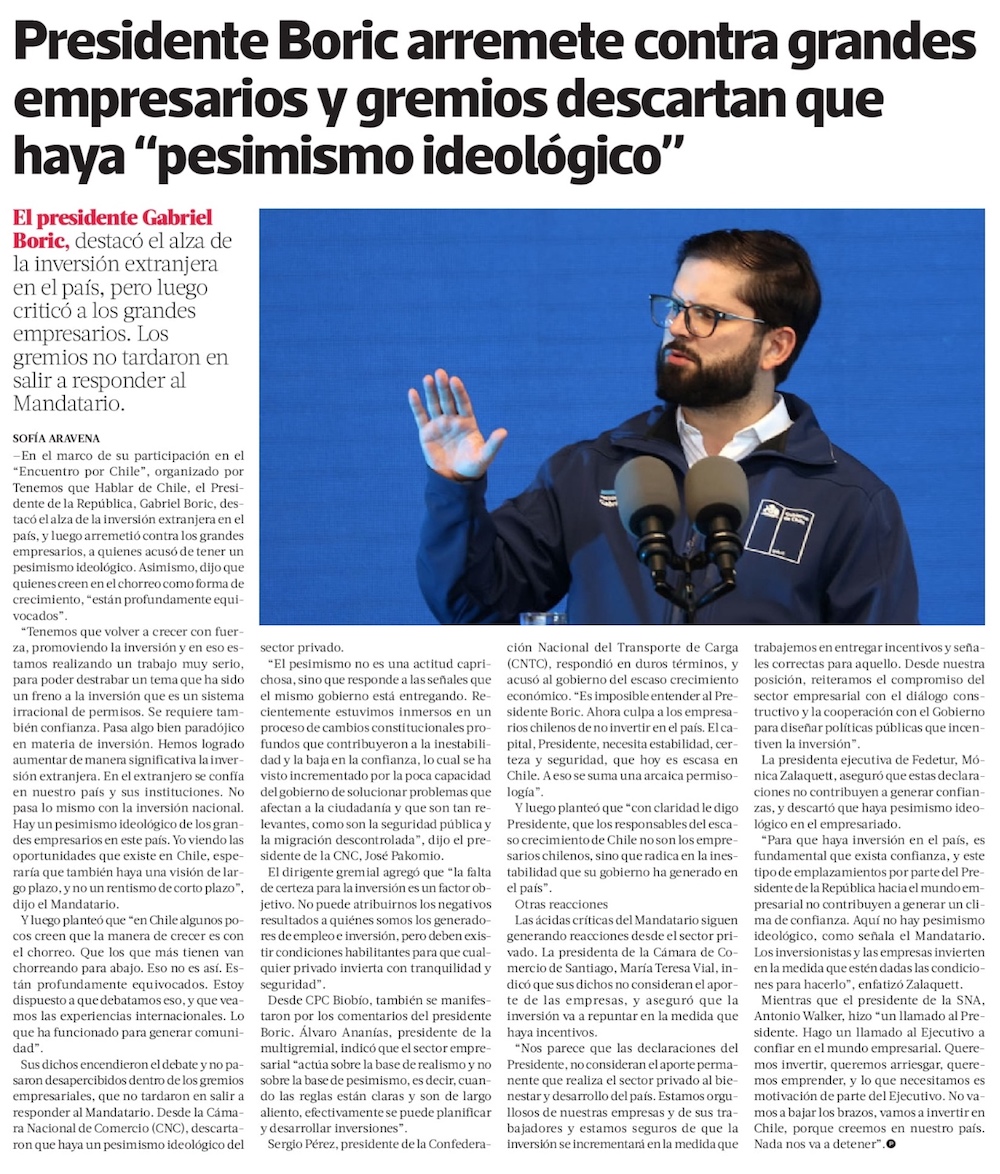 Boric arremete otra vez contra los empresarios por baja inversión y despierta masivo rechazo de los privados - (Diario Financiero)