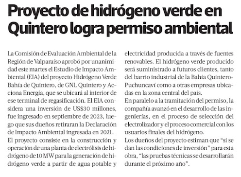 Proyecto de hidrógeno verde en Bahía de Quintero obtiene aprobación ambiental - (La Tercera Online)
