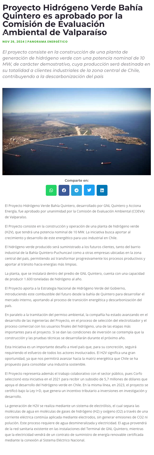 Proyecto Hidrógeno Verde Bahía Quintero es aprobado por la Comisión de Evaluación Ambiental de Valparaíso - (g5noticias.cl)