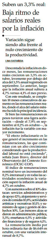 Se reduce ritmo de crecimiento de los salarios de los chilenos en octubre - (Diario Financiero)