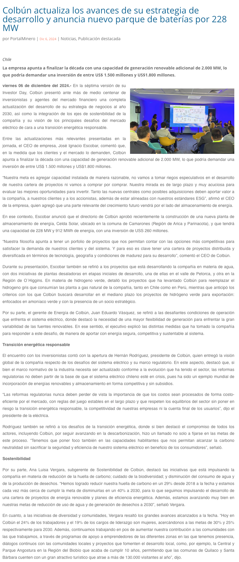 Colbún actualiza los avances de su estrategia de desarrollo y anuncia nuevo parque de baterías por 228 MW - (portalinnova.cl)