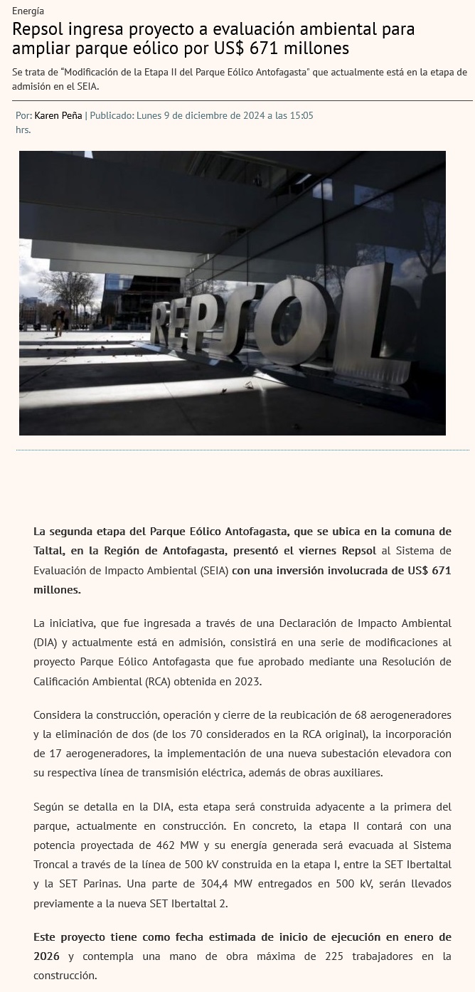 Repsol busca ampliar en US$671 millones el Parque Eólico Antofagasta - (La Segunda)