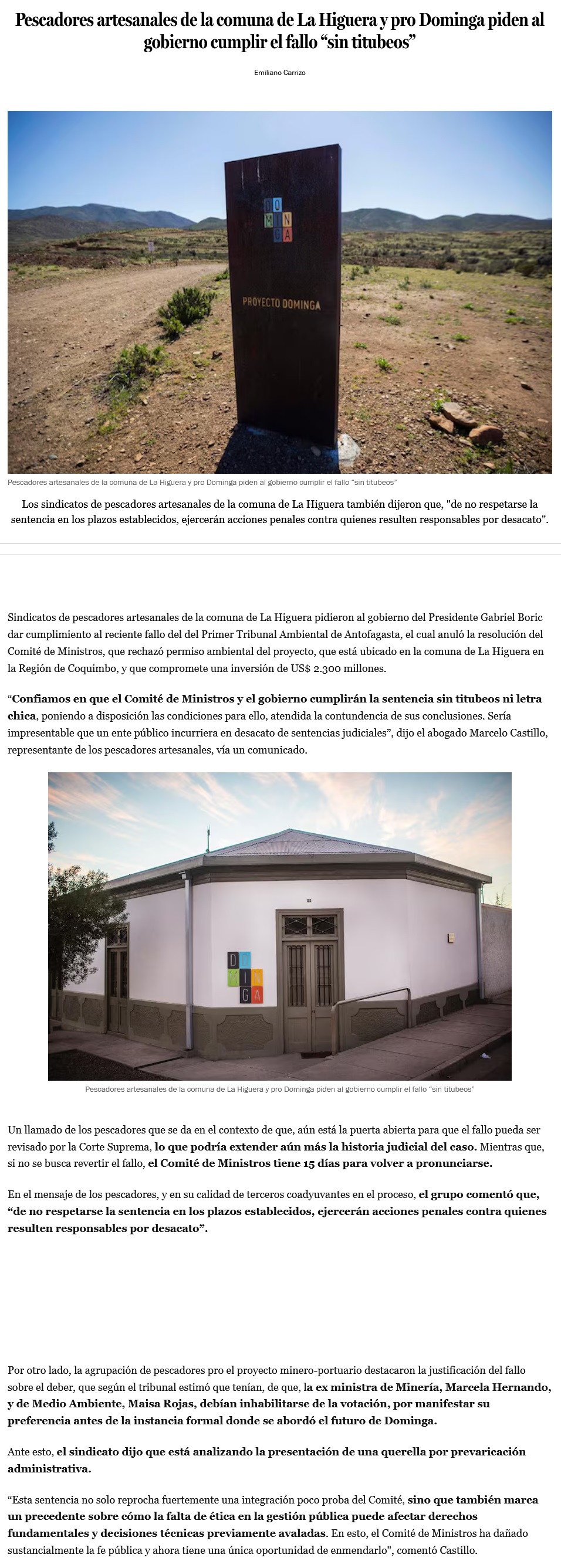 Dominga: pescadores artesanales a favor del proyecto llegan a La Moneda y 25 organizaciones rechazan fallo del tribunal - (DF Online)