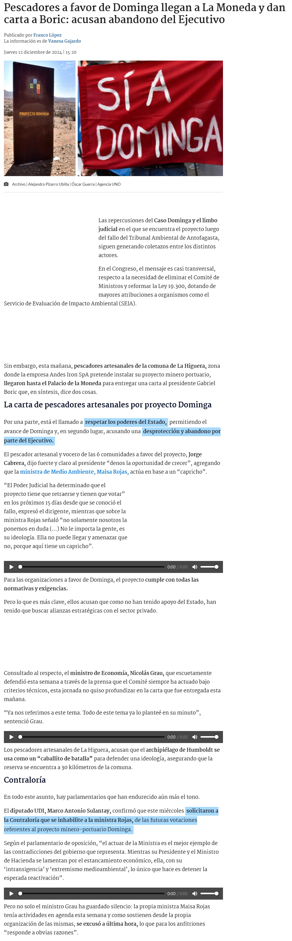 Dominga: pescadores artesanales a favor del proyecto llegan a La Moneda y 25 organizaciones rechazan fallo del tribunal - (DF Online)