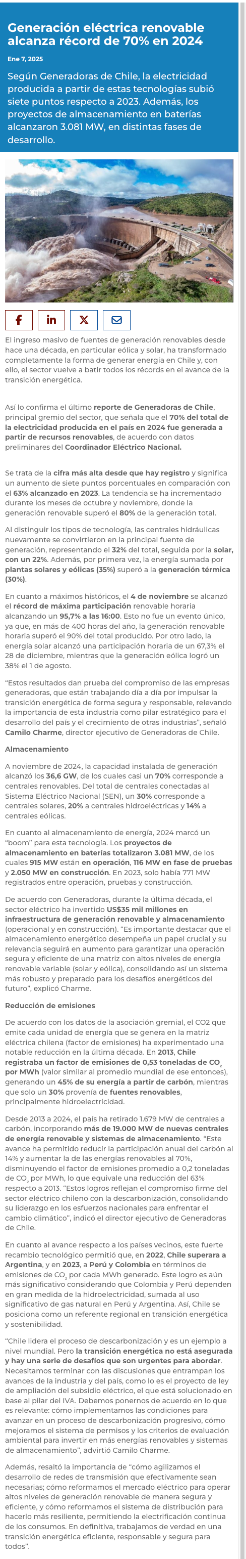 Generación eléctrica alcanza récord de 70% de energía renovable en 2024 y sector reafirma su compromiso con la descarbonización - (portalminero)