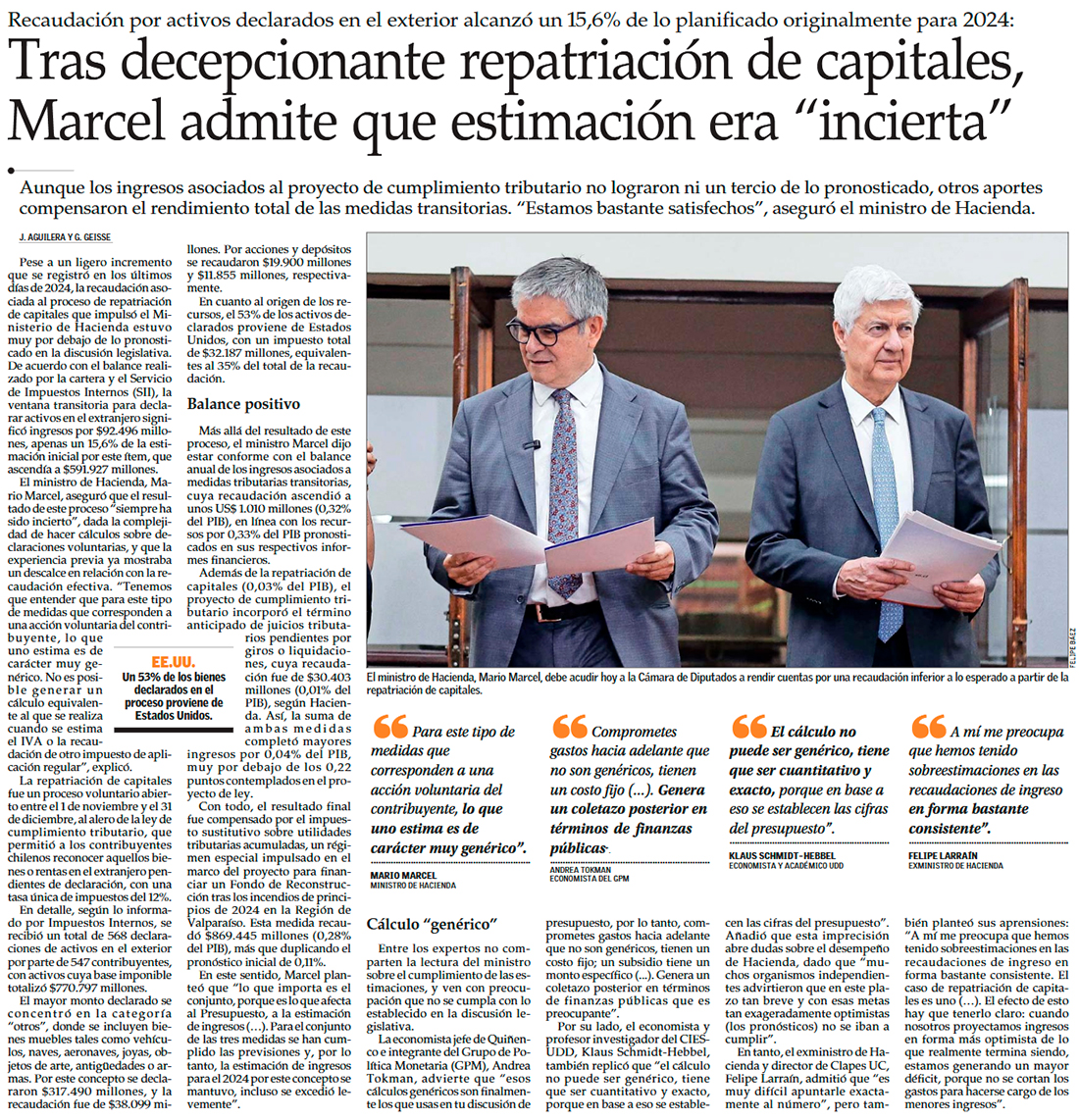 Repatriación de capitales no logra la meta, pero Marcel lo compensa con otras medidas que le reportan US$ 1.000 millones al Fisco - (Diario Financiero)