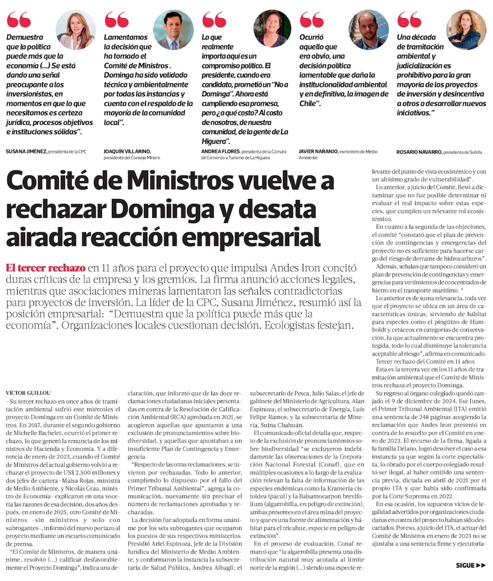 Comité de Ministros otra vez rechaza Dominga y empresa acusa “nefasto precedente, nunca visto en Chile” - (Diario Financiero)
