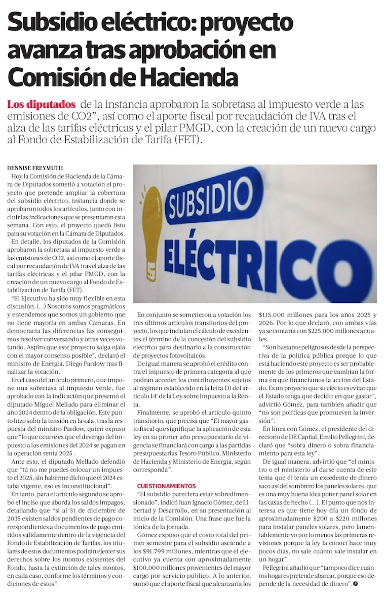 Proyecto de subsidio eléctrico logra luz verde en comisión de Hacienda de la Cámara, pero persisten las críticas - (Diario Financiero)
