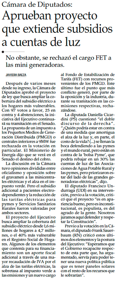 Sala de la Cámara de Diputados aprueba proyecto de subsidio eléctrico, pero rechaza el pilar PMGD por ocho votos - (Diario Financiero)