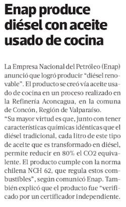 Enap estrena diésel creado a partir de aceite de cocina - (El Mercurio de Valparaíso)