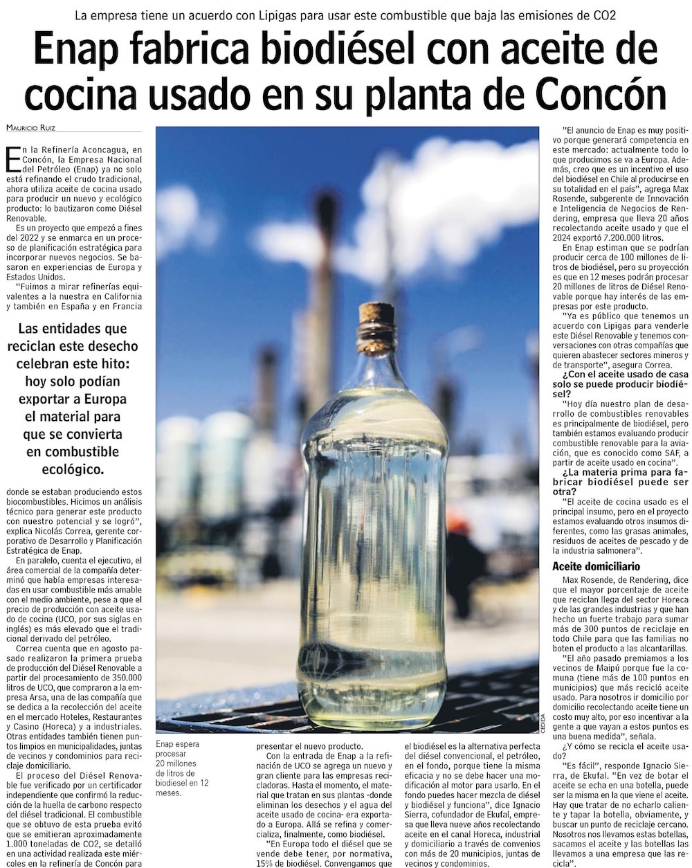 Desarrollo energético histórico en Chile: Enap produce diésel a partir de aceite usado de cocina - (radioagricultura.cl)