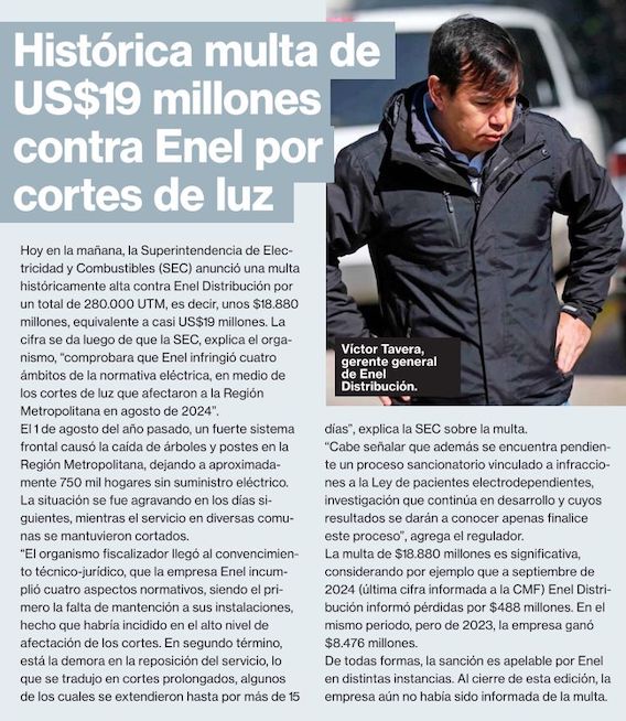 SEC sancionó a Enel con histórica multa por los cortes de luz en 2024 - (La Discusión)
