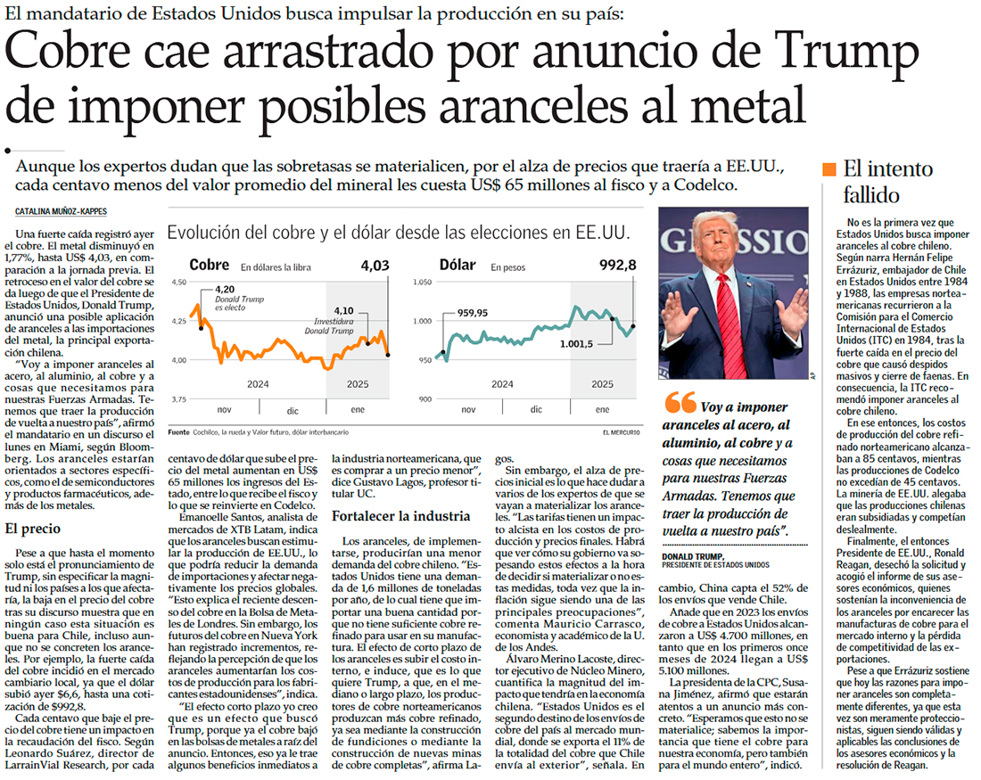 Política de Trump golpearía el precio del commodity y las alicaídas arcas fiscales chilenas - (Diario Financiero)