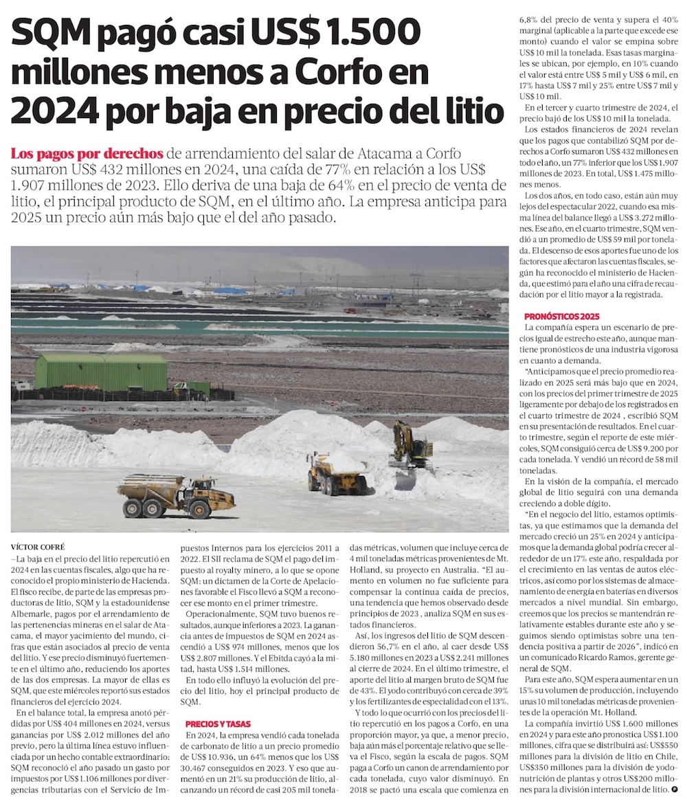 Pese a volúmenes récord de venta de litio, SQM genera pérdidas y aportes al fisco se reducen con fuerza - (Diario Financiero)