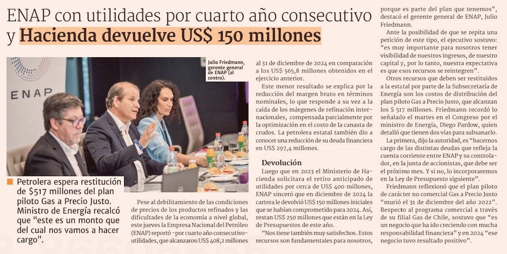 Hacienda reintegrará US$ 250 millones a Enap - (El Mercurio de Santiago)