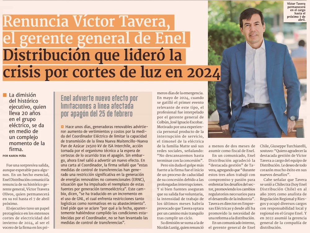 Crisis por cortes de agosto le pasa la cuenta a Enel: Víctor Tavera renuncia tras viente años en la firma - (Pulso)