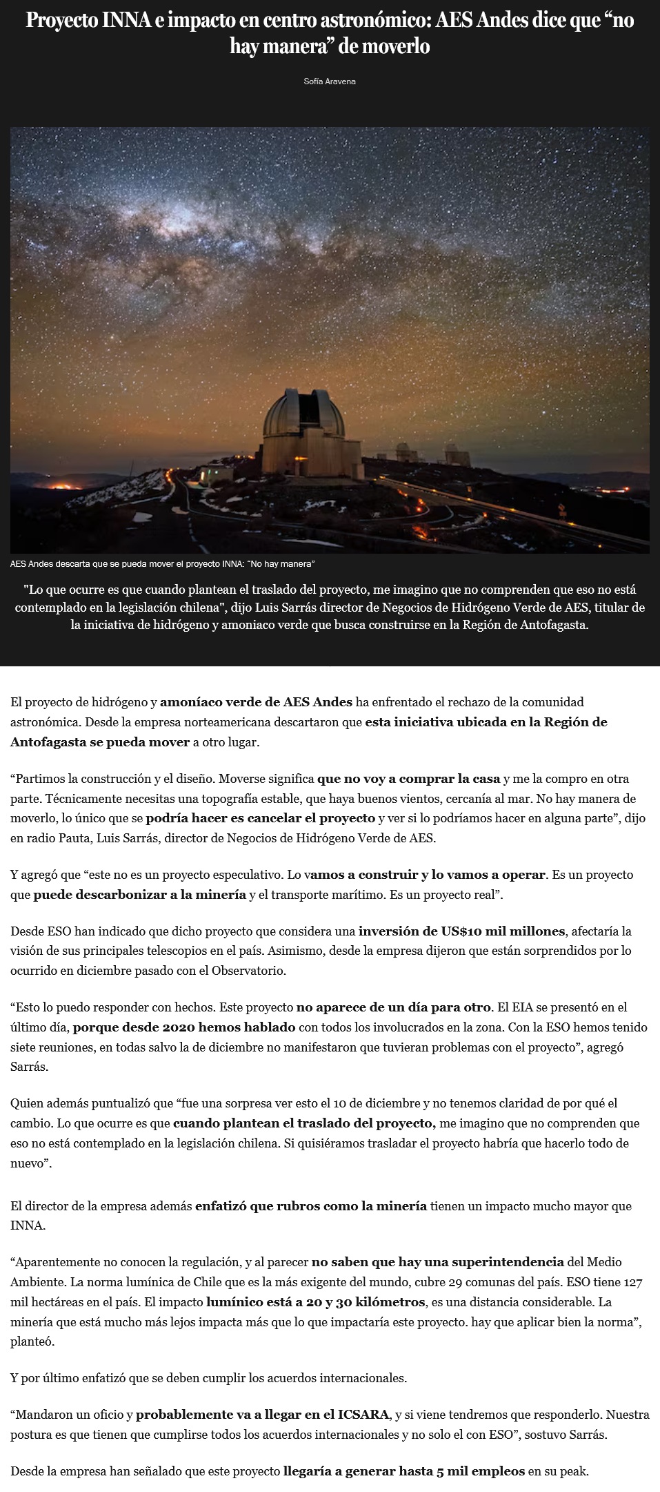 Proyecto INNA e impacto en centro astronómico: AES Andes dice que “no hay manera” de moverlo - (Pulso)