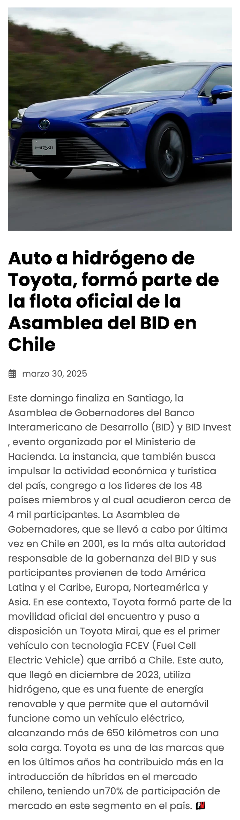 Auto a hidrógeno será parte de la flota oficial de la Asamblea del BID en Chile - (entnerd.com)
