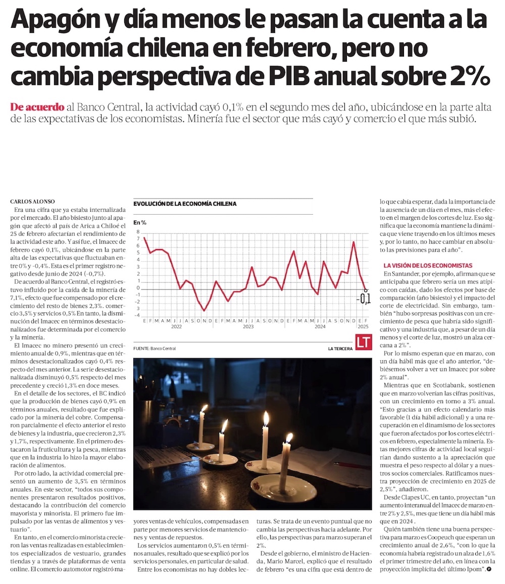 Actividad económica cae 0,1% en febrero, pero retomaría alza sobre el 2% en marzo - (Diario Financiero)