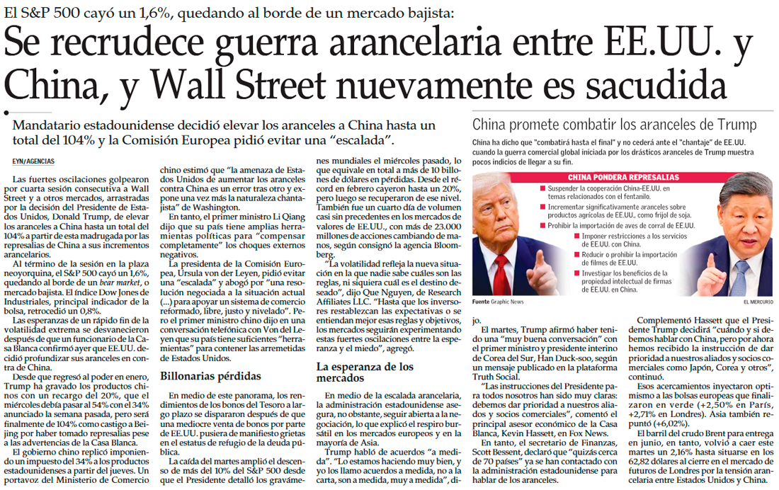 EEUU confirma aranceles de 104% a China e impide que Wall Street se sume a rebote de bolsas globales - (Diario Financiero)