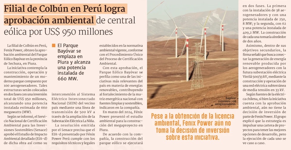 Chilena Colbún obtiene luz verde para proyecto eólico en Perú - (Diario Financiero)