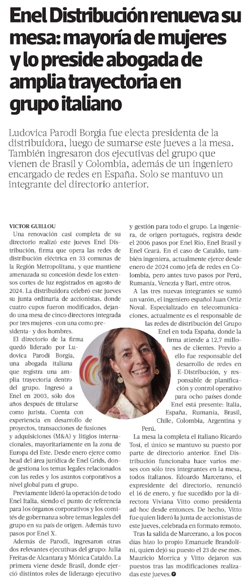 Enel Distribución elige nueva presidenta y directorio queda con mayoría de mujeres - (Diario Financiero)